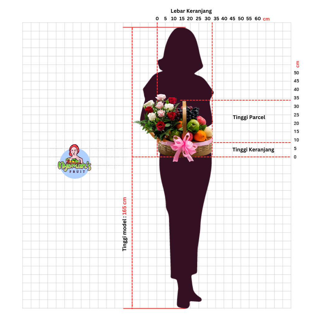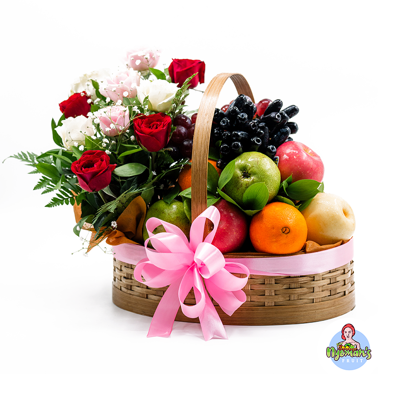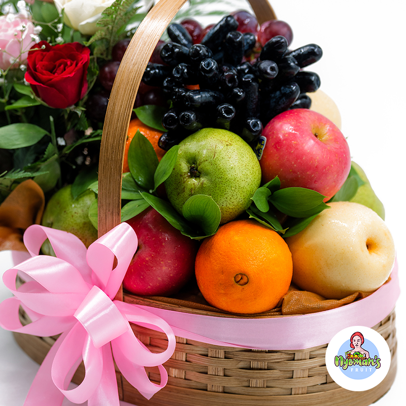 Azalea Aura menampilkan perpaduan buah segar pilihan yang disusun rapi dalam keranjang bambu oval berukuran 33 x 24 x 9 cm. Tampilannya terlihat seimbang dan penuh warna, dengan susunan pear, apple, jeruk, serta anggur yang memberi kesan segar dan berlimpah. Anyaman bambu pada keranjang memberi nuansa natural yang hangat, sementara pita pink besar di bagian depan membuat parcel ini tampak lembut dan berkelas. Di sisi kiri parcel, rangkaian bunga mawar merah, putih, dan pink dengan sentuhan baby’s breath dan daun segar menambah kesan anggun. Setiap pesanan juga dapat dilengkapi kartu ucapan yang bisa dikustomisasi sesuai kebutuhan Anda.