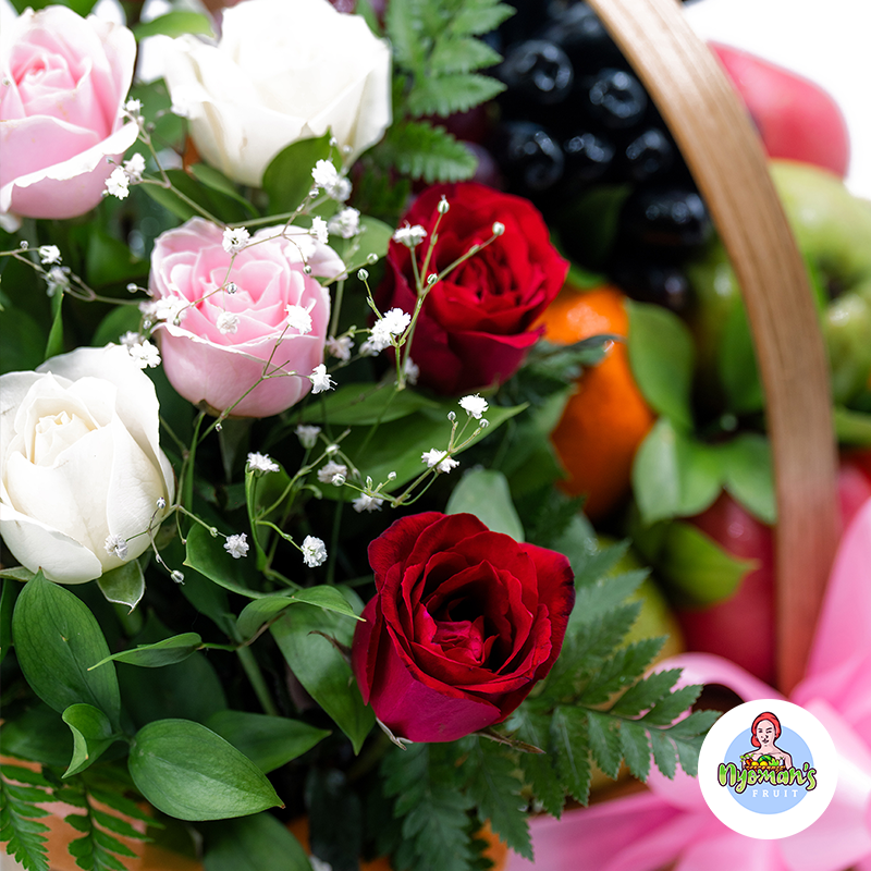 Parcel Buah Premium dengan Mawar Cerah dan Tampilan Elegan