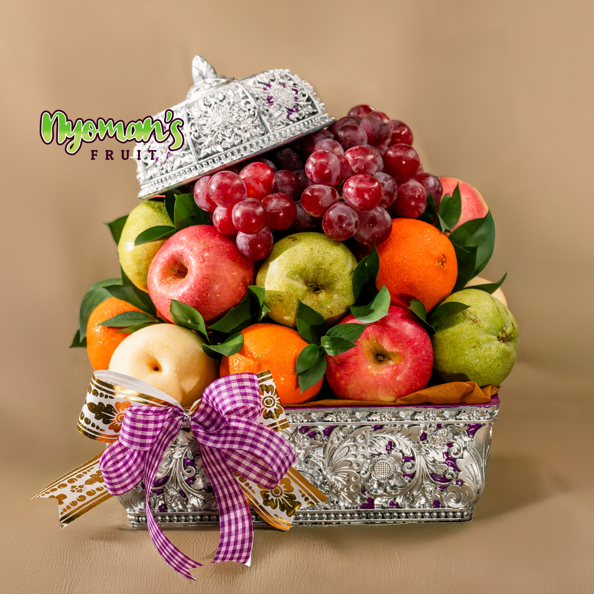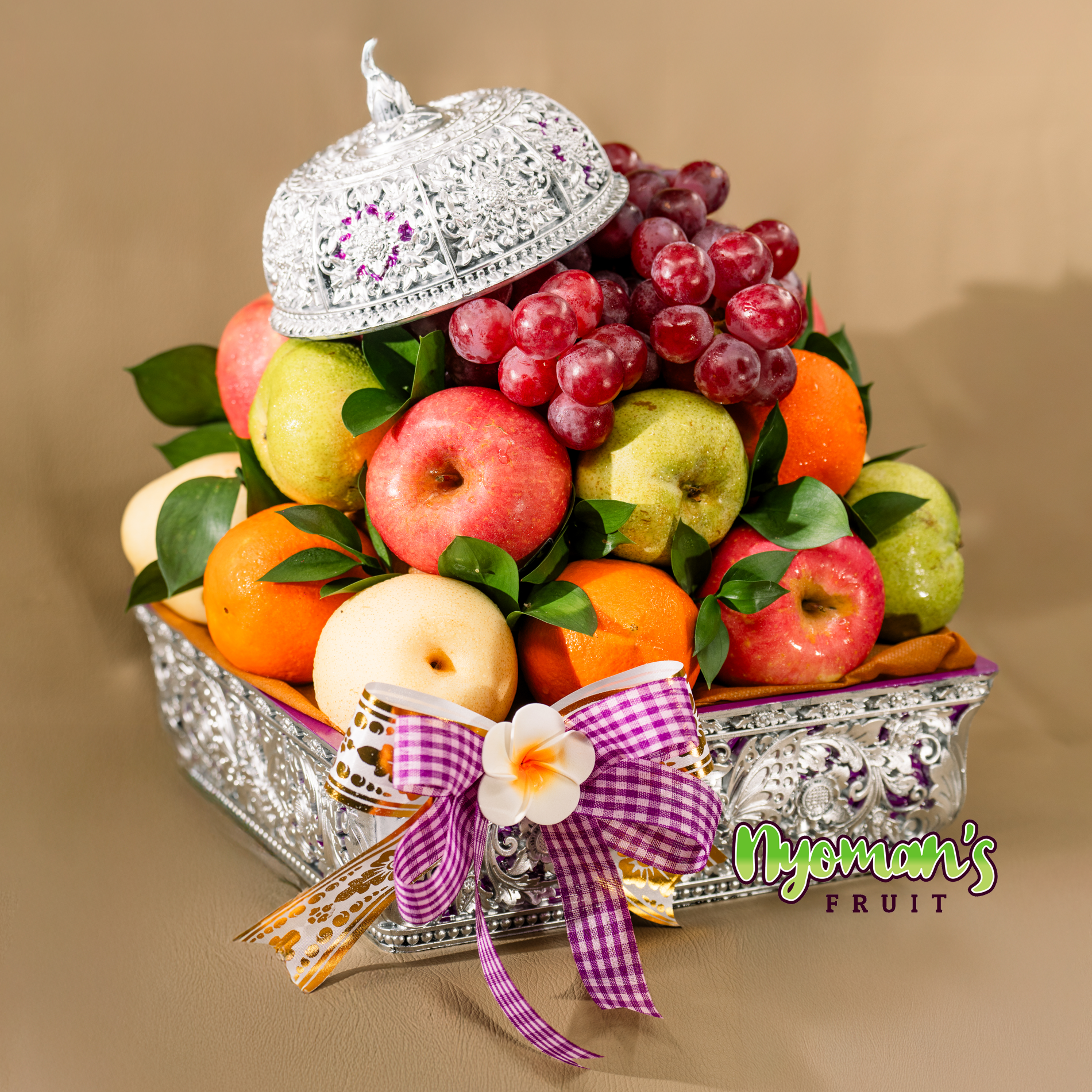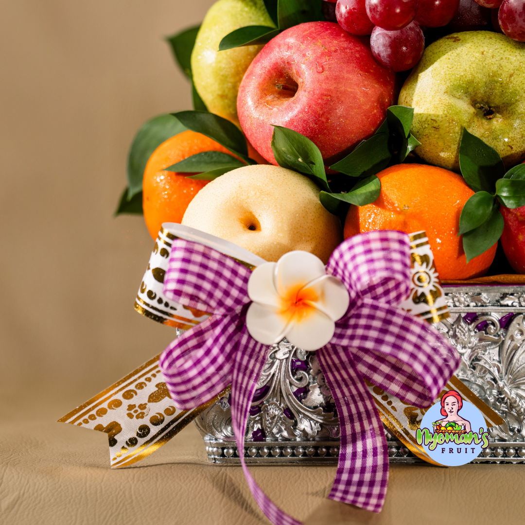 Pucuk Kamasan menghadirkan tampilan parcel yang padat, rapi, dan langsung menarik perhatian. Dari pengamatan visual produk, parcel ini menggunakan keben persegi berwarna perak dengan aksen ungu dan detail ornamen ukir yang memberi kesan mewah serta khas. Tutup keben diletakkan miring di bagian atas susunan buah sehingga tampil dekoratif dan memperkuat karakter parcel. Anggur merah menjadi titik fokus di bagian atas, lalu dipadukan dengan apple Fuji, pear hijau, pear century, dan jeruk Sunkist yang membentuk komposisi warna merah, hijau, krem, dan oranye yang segar. Daun segar di sela buah membuat tampilannya terasa lebih hidup, sementara pita motif kotak ungu putih dipadukan pita putih emas memberi sentuhan manis yang tetap elegan. Produk ini juga dilengkapi kartu ucapan yang bisa dikustomisasi sesuai kebutuhan Anda.