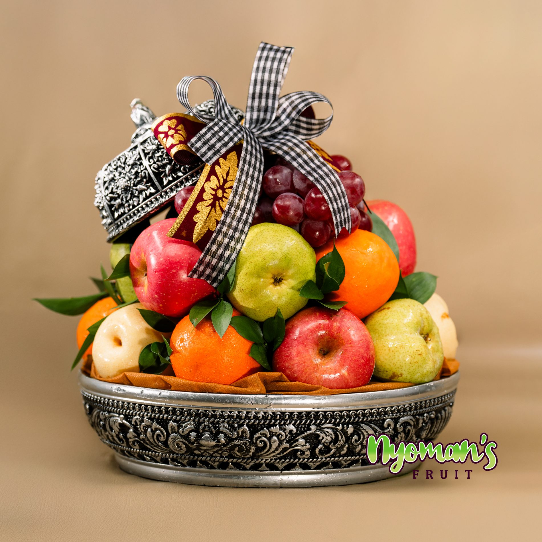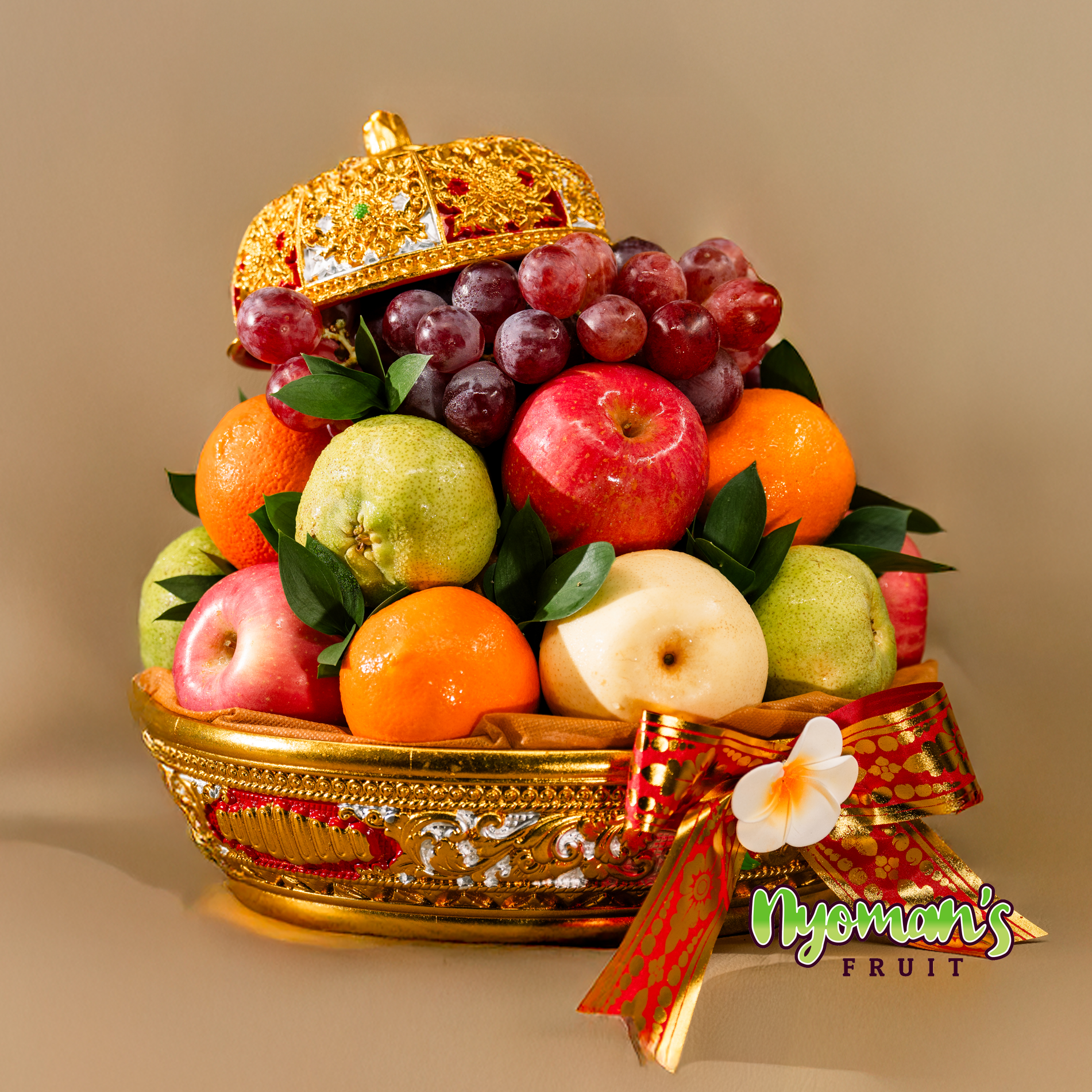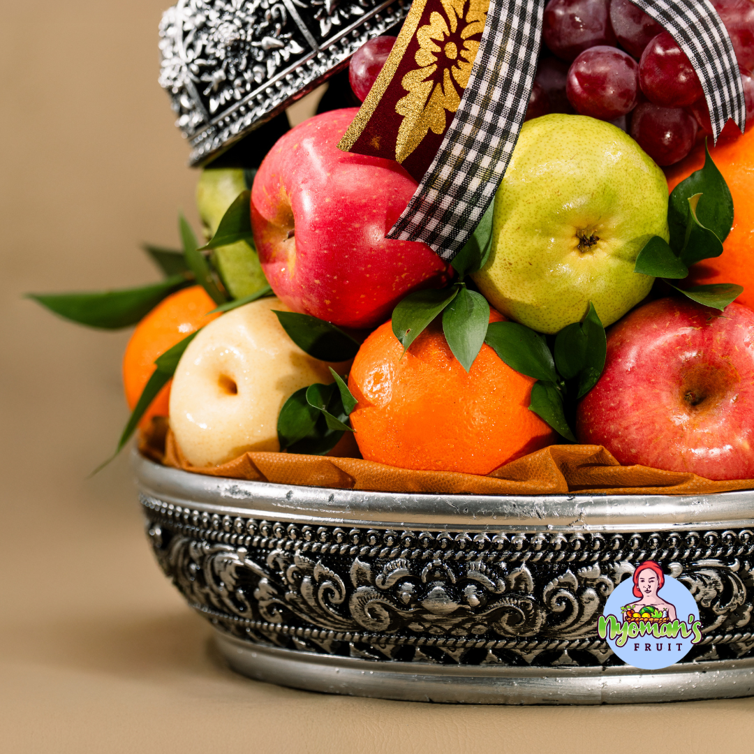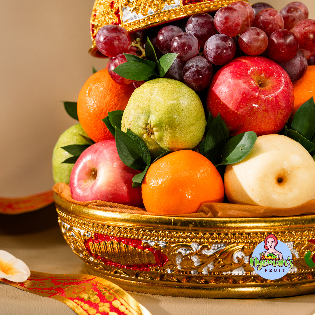 Tunjung Wanasari menampilkan susunan buah yang padat, rapi, dan menarik dengan karakter visual yang kuat. Parcel ini menggunakan keben bulat dengan pilihan warna hitam perak atau kuning emas dan emrah dengan detail ornamen ukir yang memberi kesan klasik dan berkelas. Tutup keben diletakkan miring di bagian atas susunan buah sehingga tampil unik dan tetap terasa dekoratif. Buah disusun bertingkat dengan anggur merah di bagian atas sebagai fokus utama, lalu dipadukan apple Fuji, pear hijau, pear century, dan jeruk Sunkist yang membentuk kombinasi warna merah, hijau, krem, dan oranye yang segar. Daun segar di sela buah membuat tampilannya lebih hidup, sementara pita motif kotak hitam putih dengan aksen pita merah emas memberi sentuhan manis yang kontras namun tetap harmonis. Produk ini juga dilengkapi kartu ucapan yang bisa dikustomisasi sesuai kebutuhan Anda.